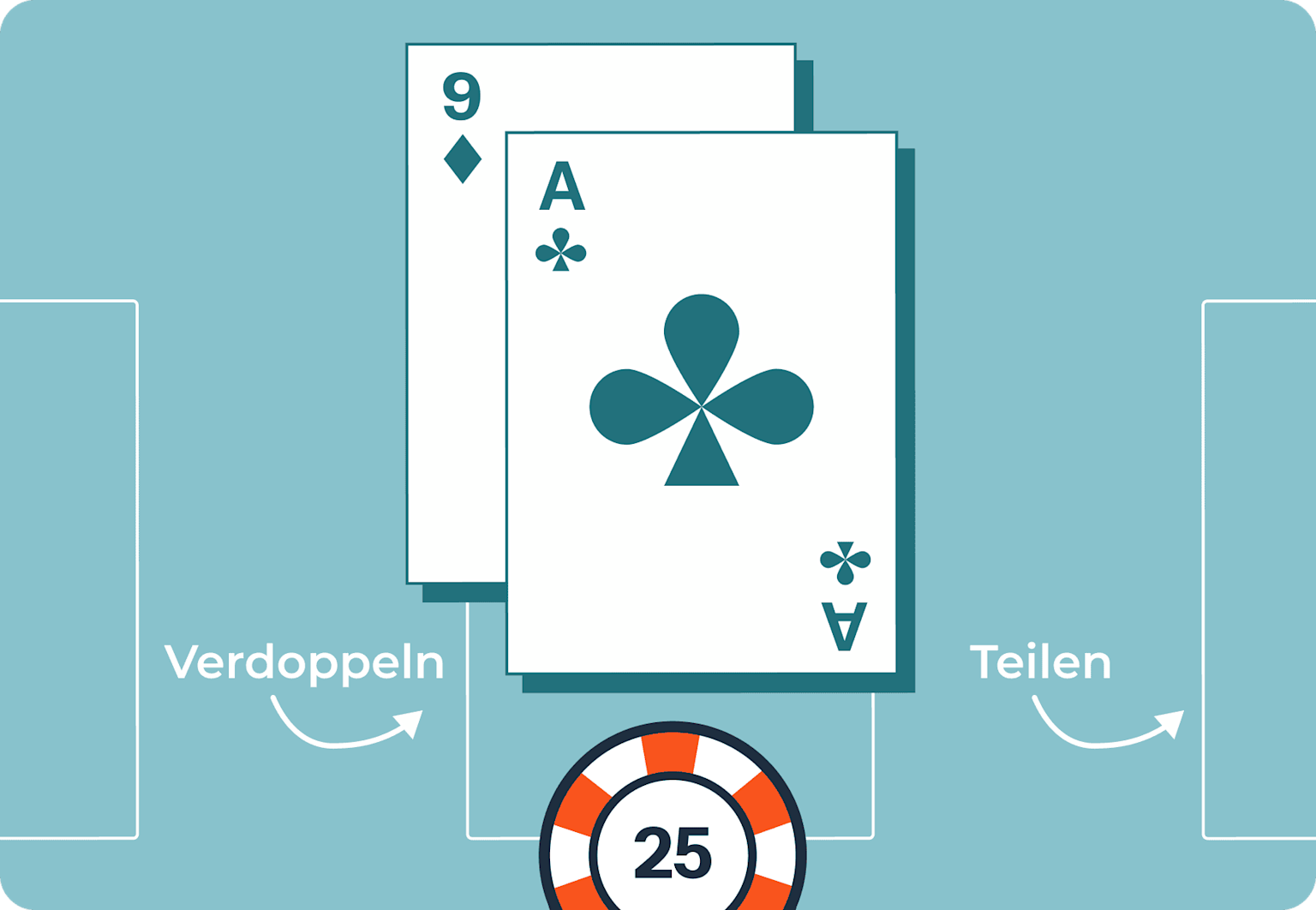 Hast du zwei identische Karten bekommen, zum Beispiel zweimal eine fünf, kannst du deine Hand teilen. Danach musst du einen zweiten Einsatz machen. Somit spielst du mit zwei Kartenhänden weiter.