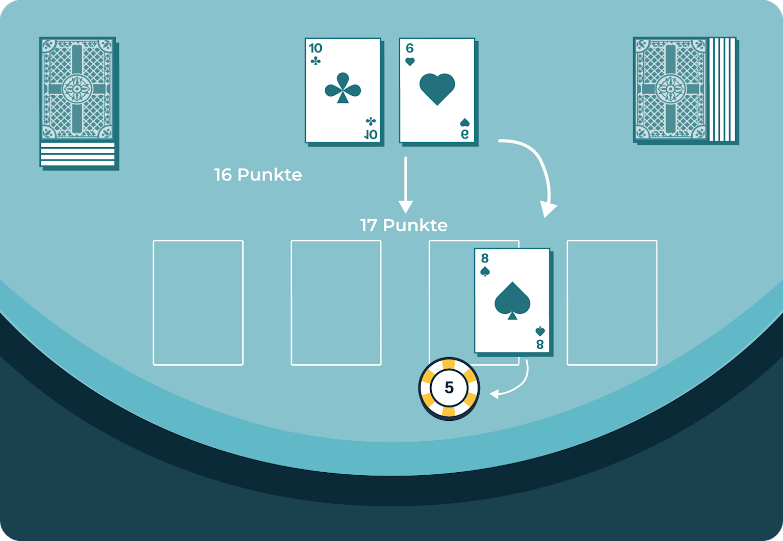 Bei Soft Hands zählt das Ass elf Punkte, zum Beispiel Ass + 6 ist eine soft 17. Bei Soft Hands hast du mehr Spielraum, denn im Ernstfall kannst du das Ass auch als einen Punkt zählen. Deshalb kannst du hier ein bisschen mehr Risiko eingehen und eine weitere Karte ziehen. Weitere Beispiele findest du hier: