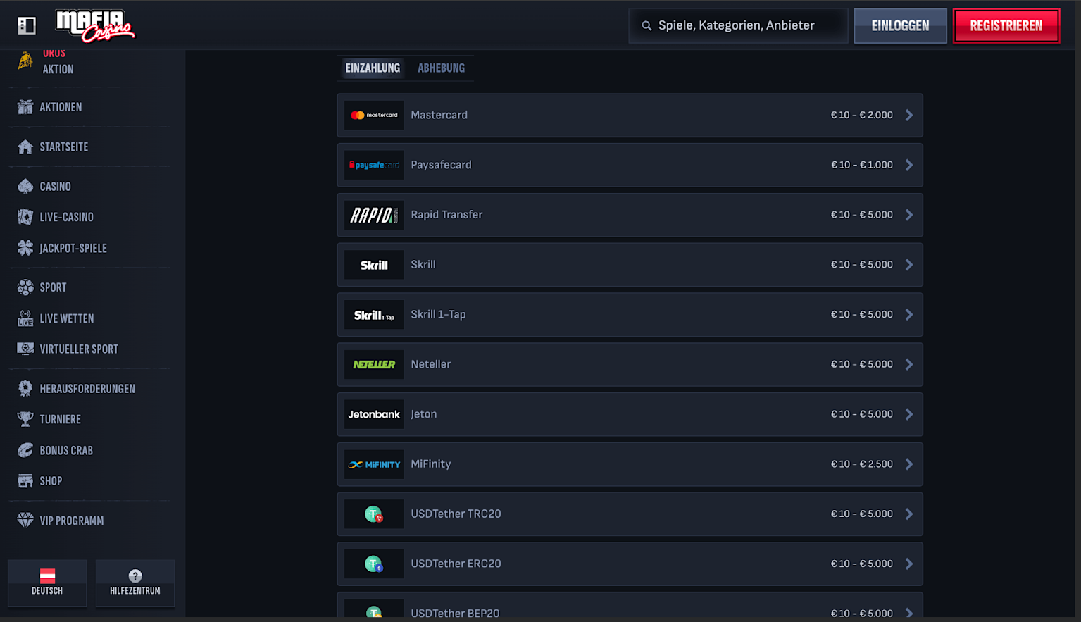 Bei den Zahlungsarten zeigt sich ein breites Angebot, das sowohl klassische Spieler als auch Fans von Krypto Casinos anspricht. Eine MafiaCasino Einzahlung ist bereits ab 10 € möglich. Je nach Zahlungsmethode liegen die Limits zwischen 1.000 und 5.000 € pro Transaktion. Bei Bitcoin ist der Mindestbetrag mit 30 € leider etwas höher. Einzahlungen schreibt dir MafiaCasino in der Regel sofort gut.