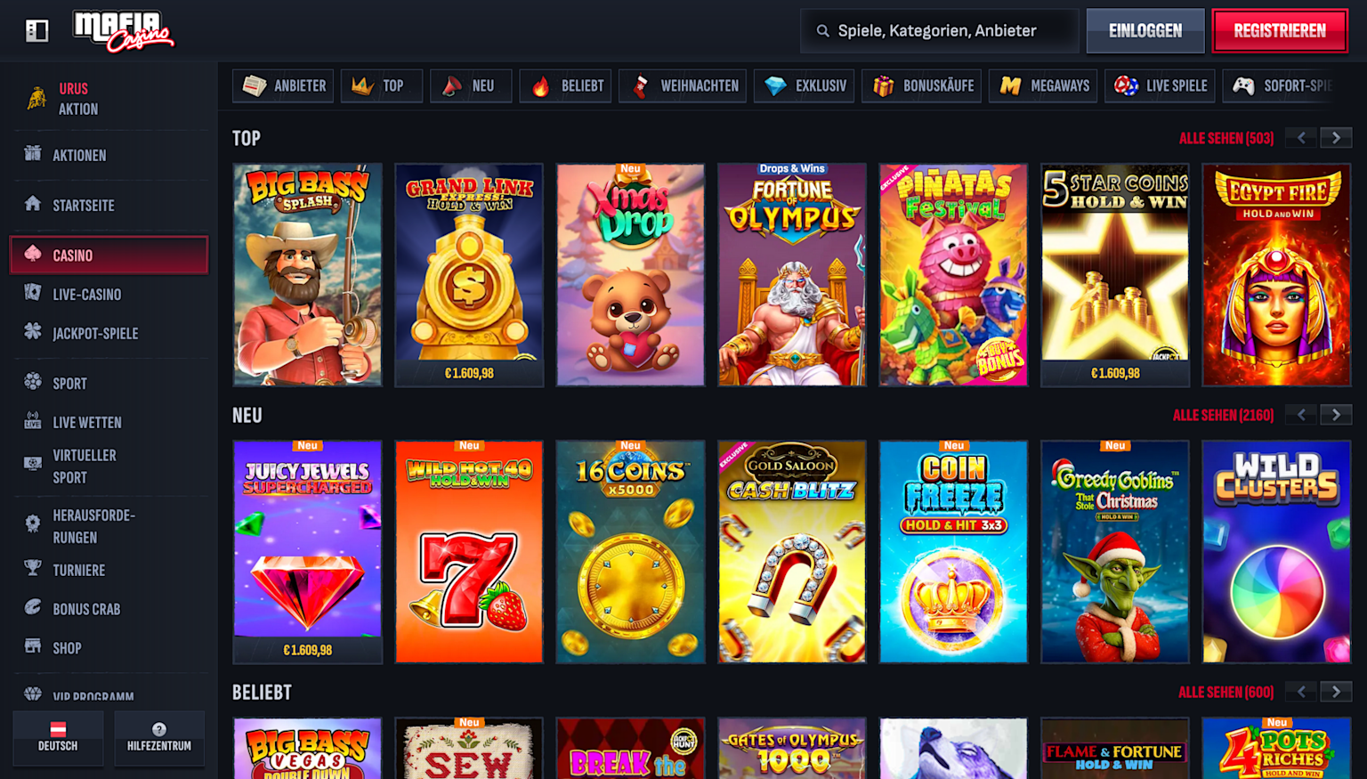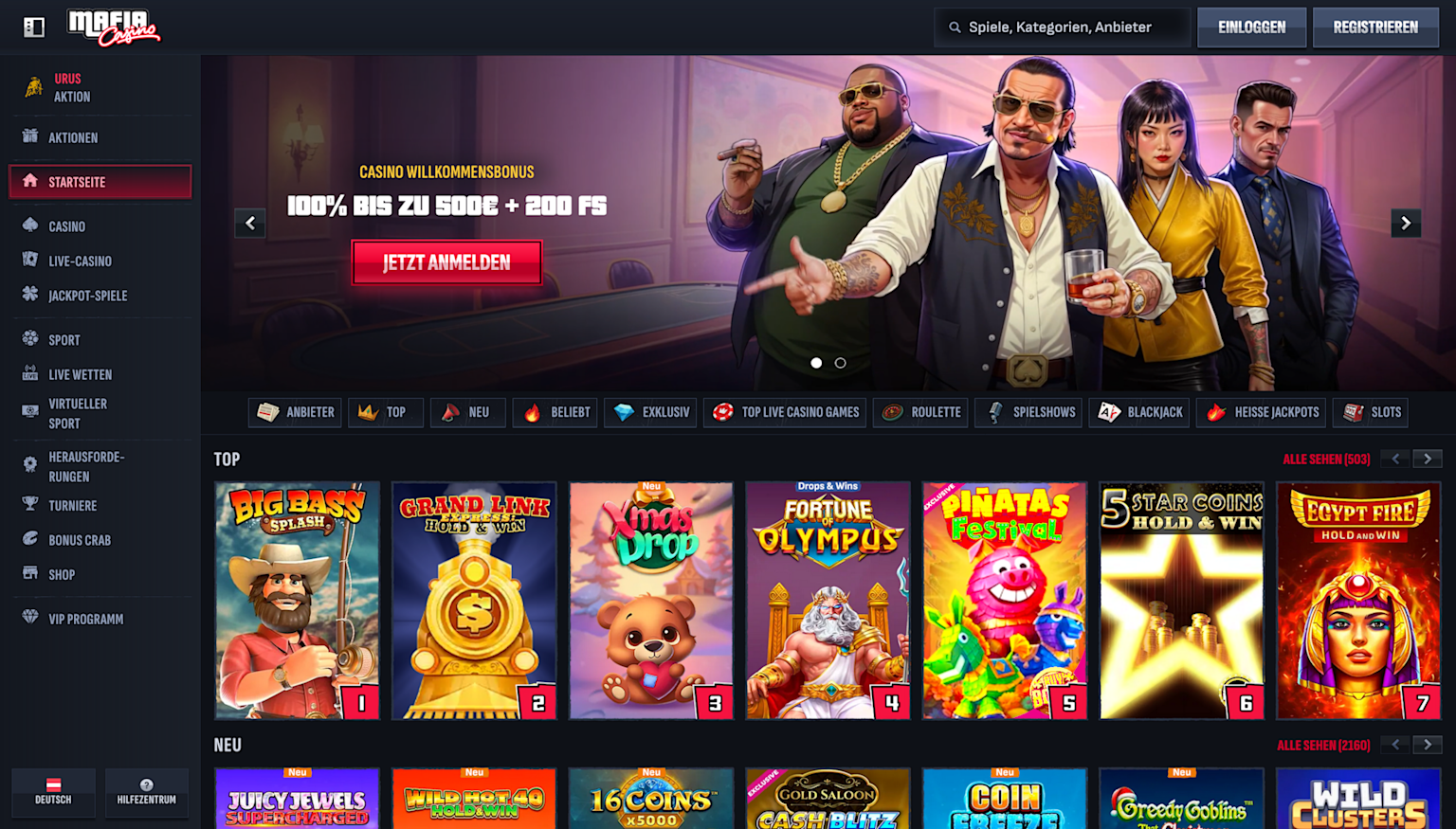 Bei MafiaCasino erwartet dich eine riesige Auswahl von über 12.000 Online Spielautomaten. Von bekannten Titeln wie Big Bass und Gates of Olympus 1000 bis hin zu modernen Megaways, Bonus-Buy- und Hold-and-Win-Slots ist alles dabei.