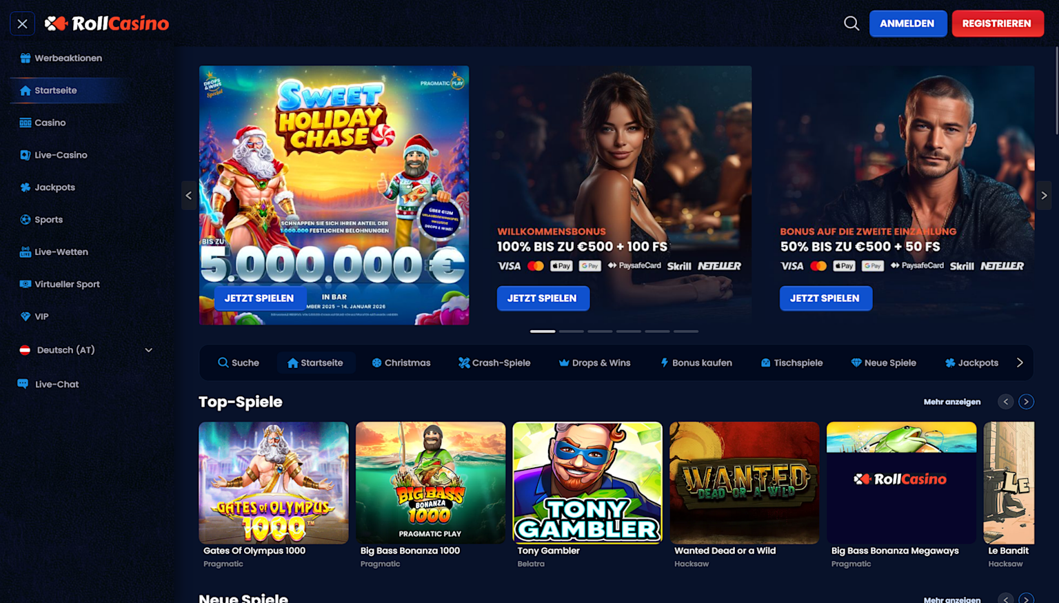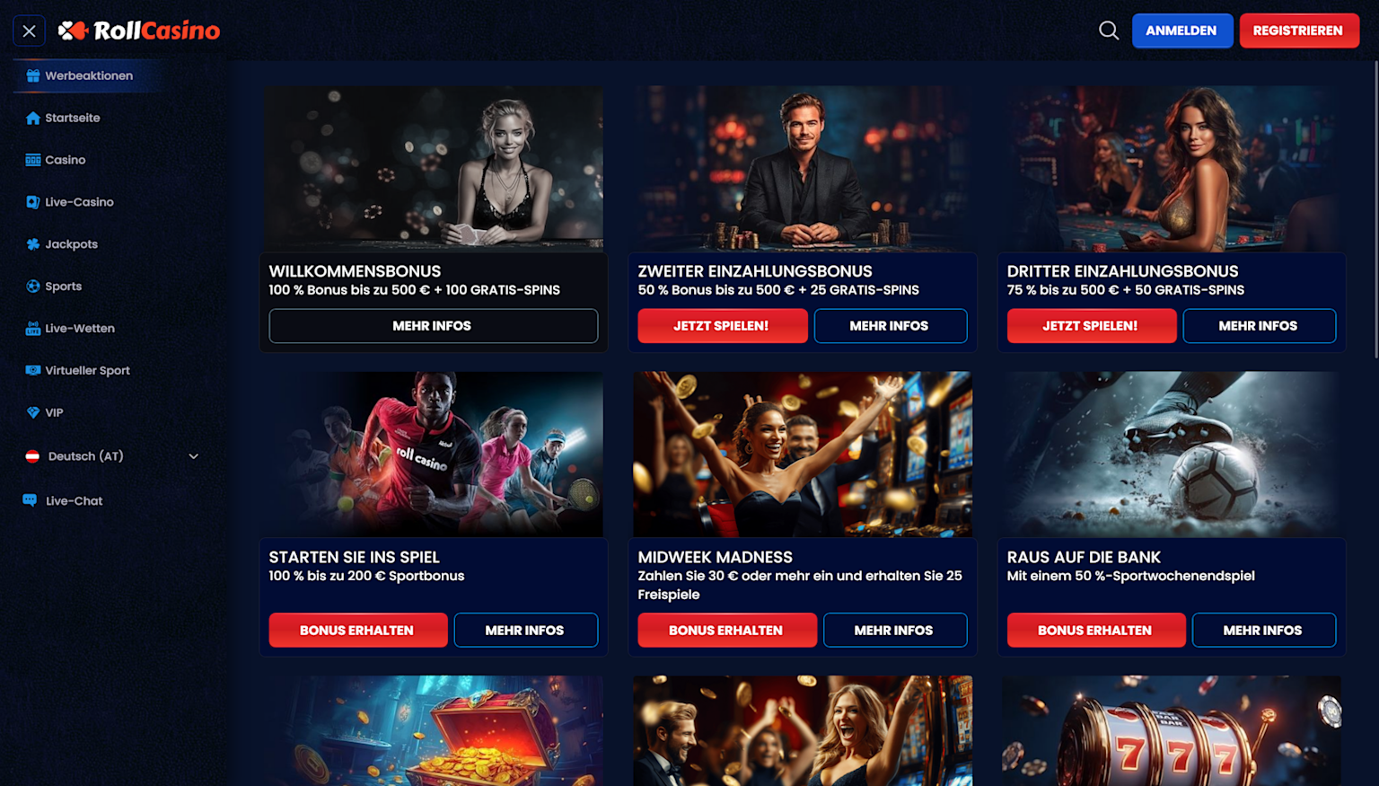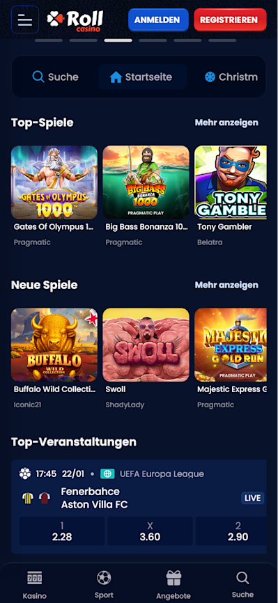 RollCasino präsentiert sich als modernes Online Casino, das vor allem Slot-Fans anspricht. Mit attraktiven Boni, einer flotten Performance und unkomplizierten Einzahlungen macht das Spielen Spaß, egal ob am Handy oder am Computer. Die Casinoseite ist außerdem übersichtlich und für Einsteiger gut geeignet.