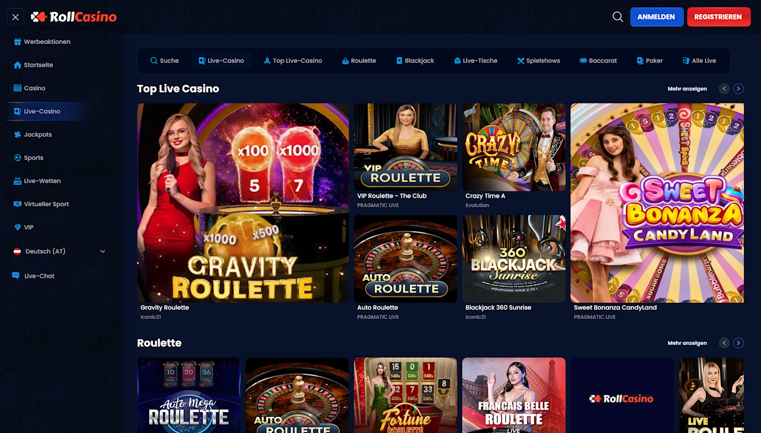 Im Live-Casino von RollCasino kommt echtes Casino-Feeling auf – fast wie ein Abend im Casino Baden oder ein Kurztrip nach Wien, nur gemütlich von daheim aus. Gespielt wird per Livestream mit echten Dealern, hauptsächlich von bekannten Studios wie Evolution Gaming und Pragmatic Play.
