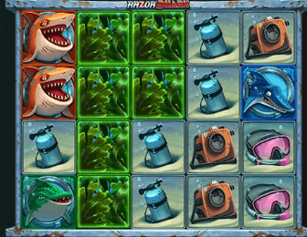 ![]() | Die Razor Reveal-FunktionDiese Bonus-Funktion wird aktiviert, wenn der besagte goldene Hai durch die Mystery Stacks aufgedeckt wird. Nun beginnen sich alle vom Seegras der Mystery Stacks bedeckten Symbole zu drehen und zeigen entweder einen Multiplikator Wert oder Scatter Symbole auf. |